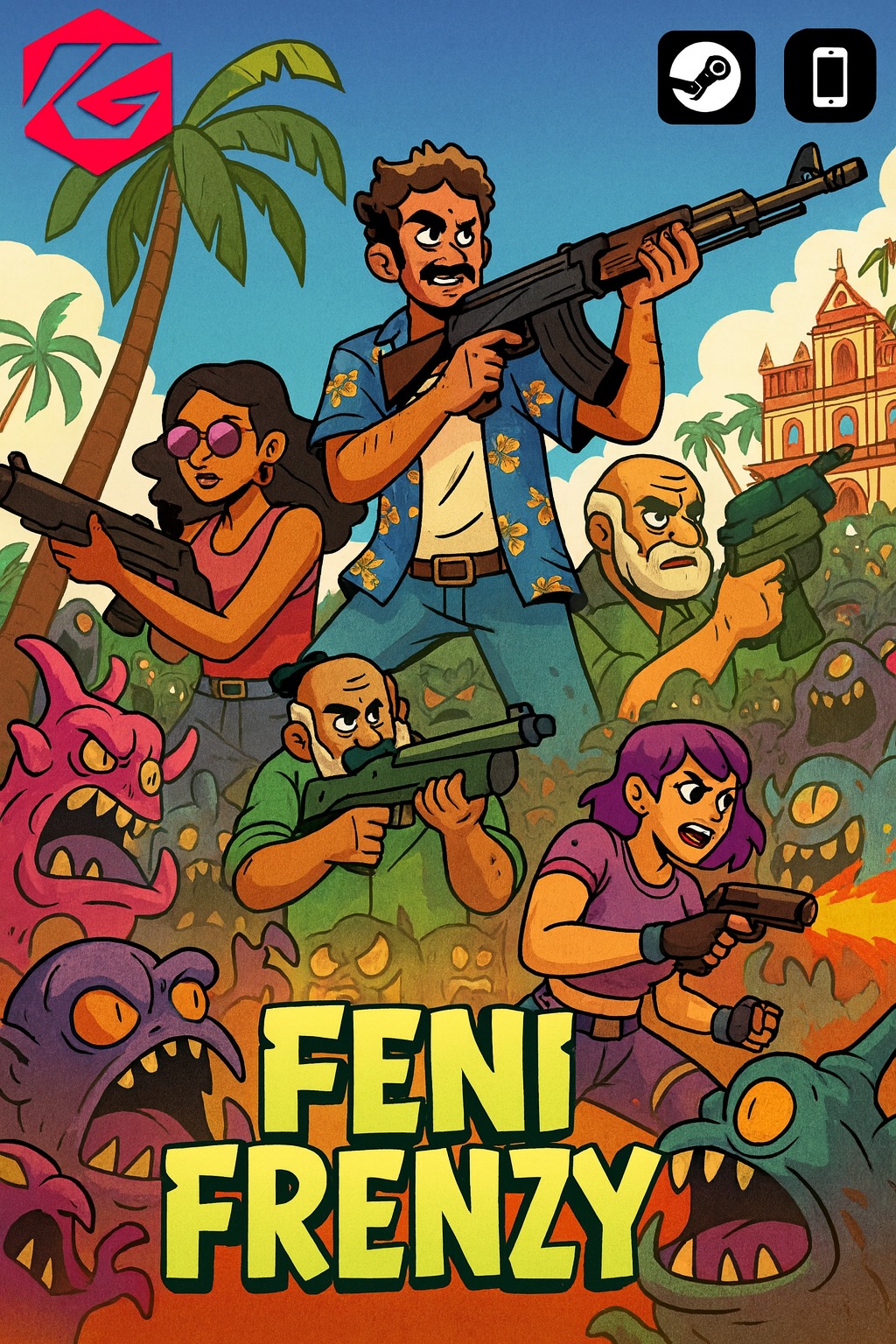 Feni Frenzy is a funky, cel-shaded PVE co-op action shooter set in a fictional COVID-era Goa.